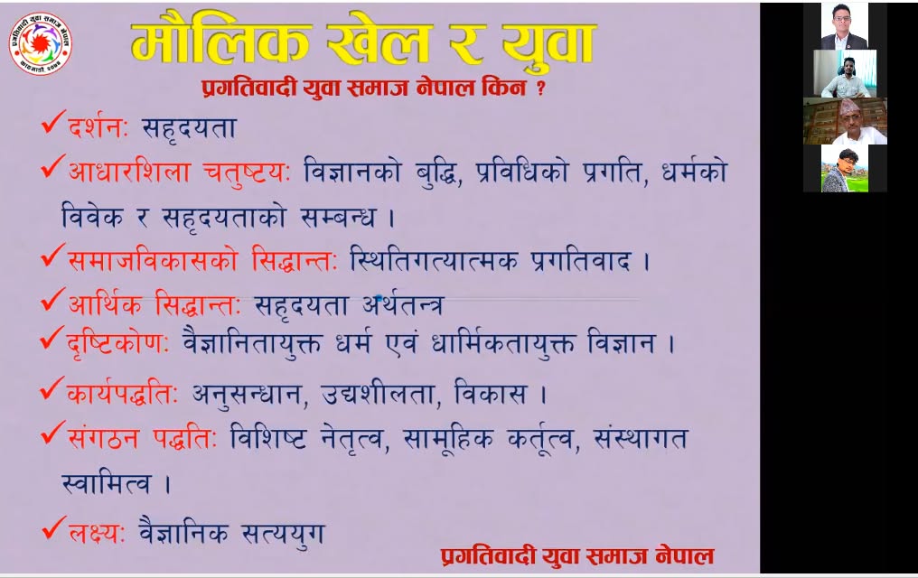 प्रगतिवादी युवा समाज नेपालको आयोजनामा वि.सं. २०७७ साल असार २० गते “कस्ता युवाहरू राजनीतिमा आउनुपर्छ” विषयक वृहत अनलाइन कार्यक्रम सम्पन्न भएको छ। कोभिड–१९ महामारीको सन्दर्भमा डिजिटल माध्यममार्फत आयोजित उक्त कार्यक्रमले युवाहरूको राजनीतिक सहभागिता, नेतृत्व क्षमता तथा नैतिक मूल्य–मान्यताबारे व्यापक छलफल गरेको थियो ।